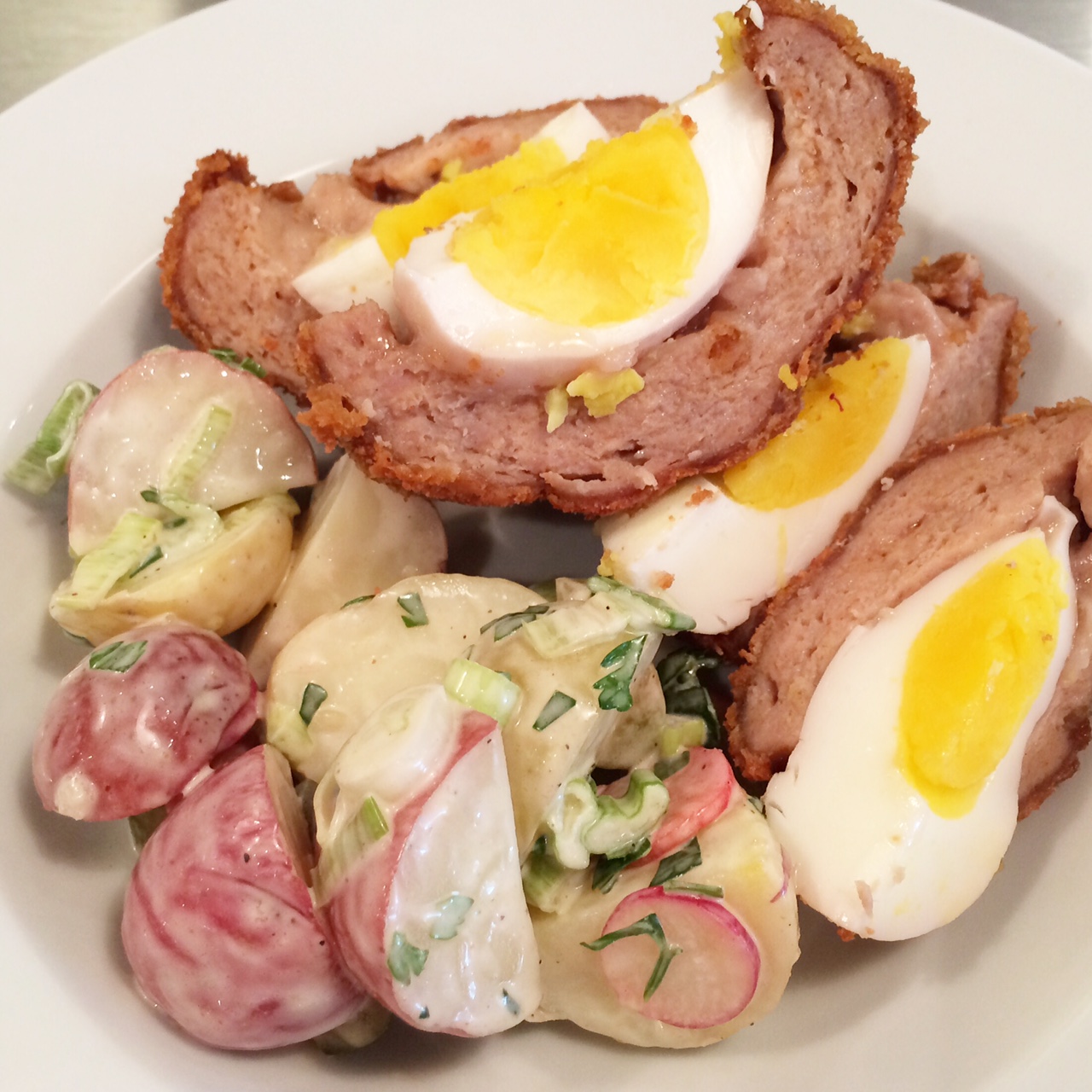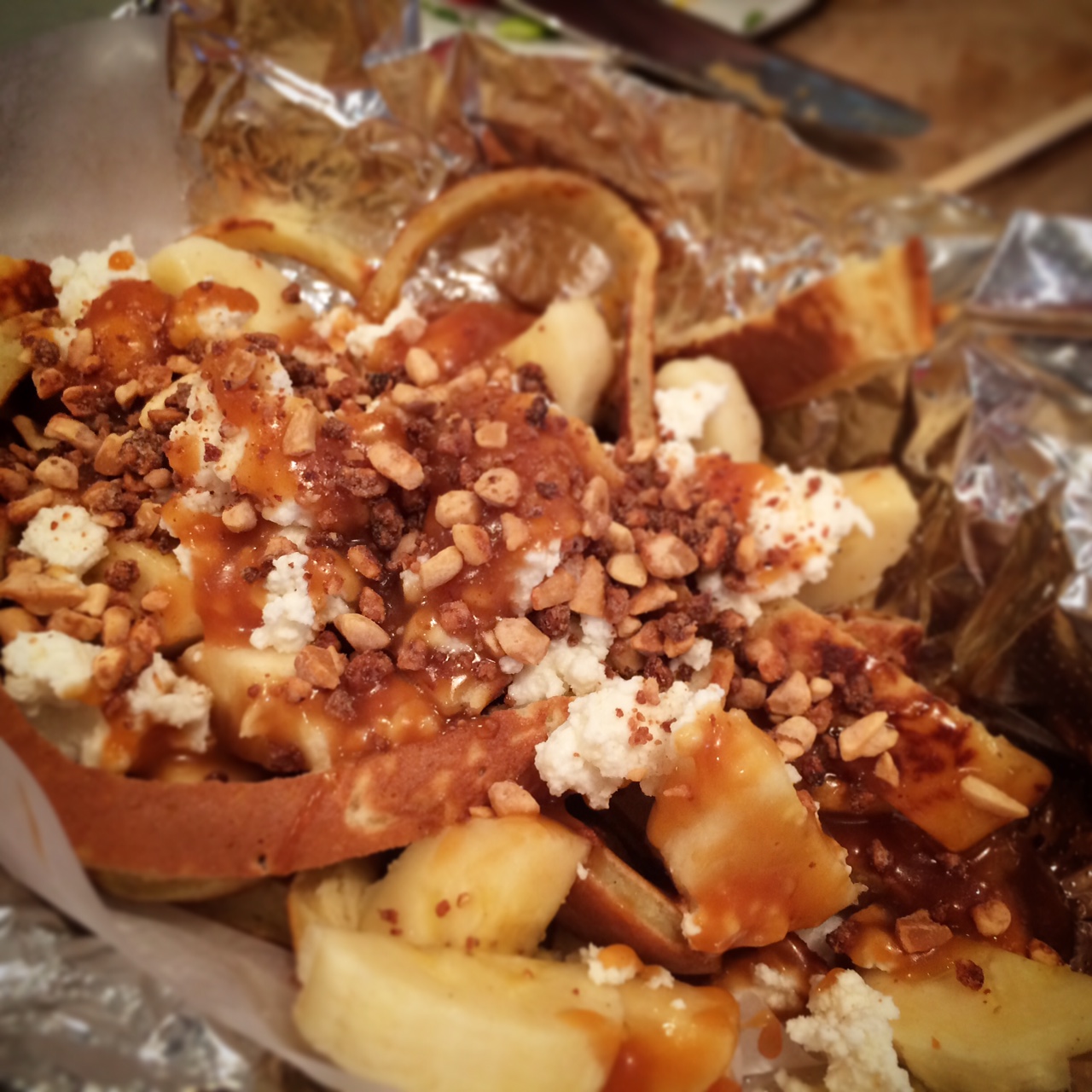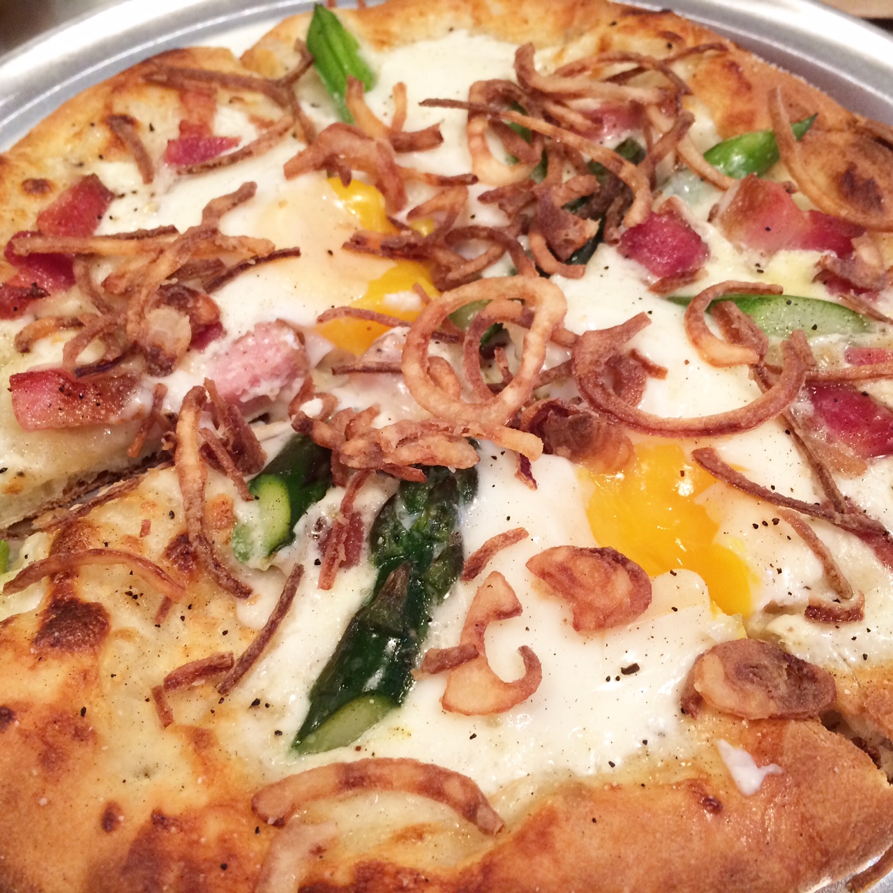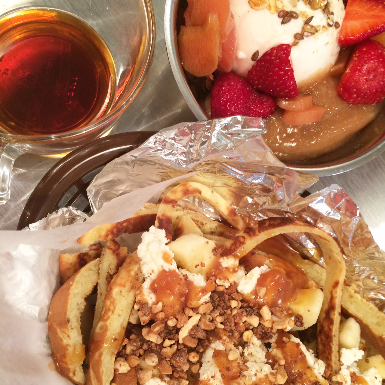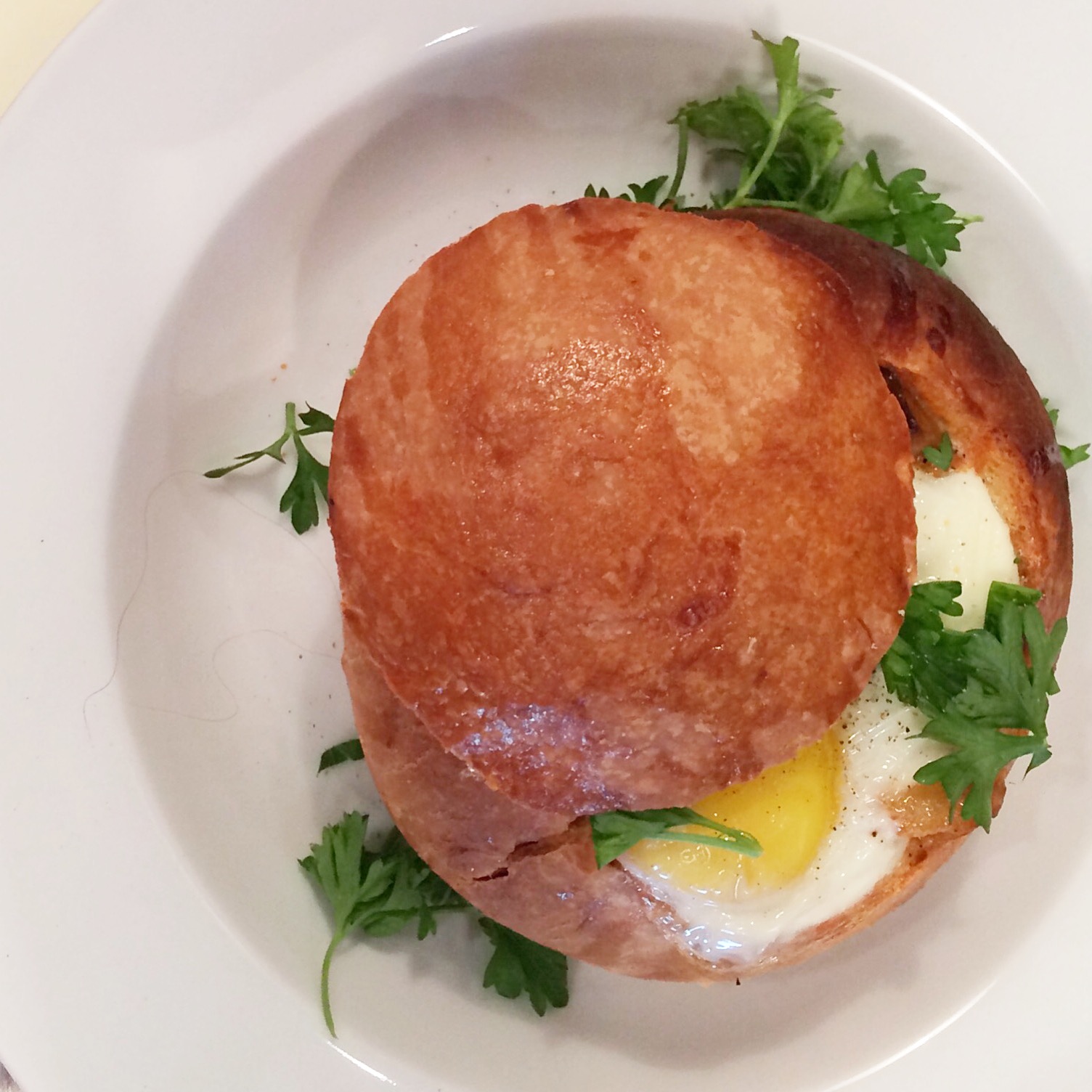 Cette pâtisserie du Plateau Mont-Royal ouverte depuis 2011 offre maintenant un menu brunch! 6 choix s’offrent à vous: la pizza déjeuner, la guédille de crevette nordiques, la yogourt glacé et mueslis maison, le scotch egg, la poutine sucré pancake-ricotta-banane-peanut-érable (ouf!) et la brioche farcie de ratatouille, chèvre et oeuf. Chacun de ces choix est servi avec café filtre et le beigne du jour pour 14$ à 18$. J’ai eu la chance de goûter à chacun de ces plats. J’ai évidemment pris des photos en vrai foodie que je suis, donc observez un peu par vous même. (Avertissement: ce qui suit pourrait vous faire saliver, surtout si vous avez faim!)