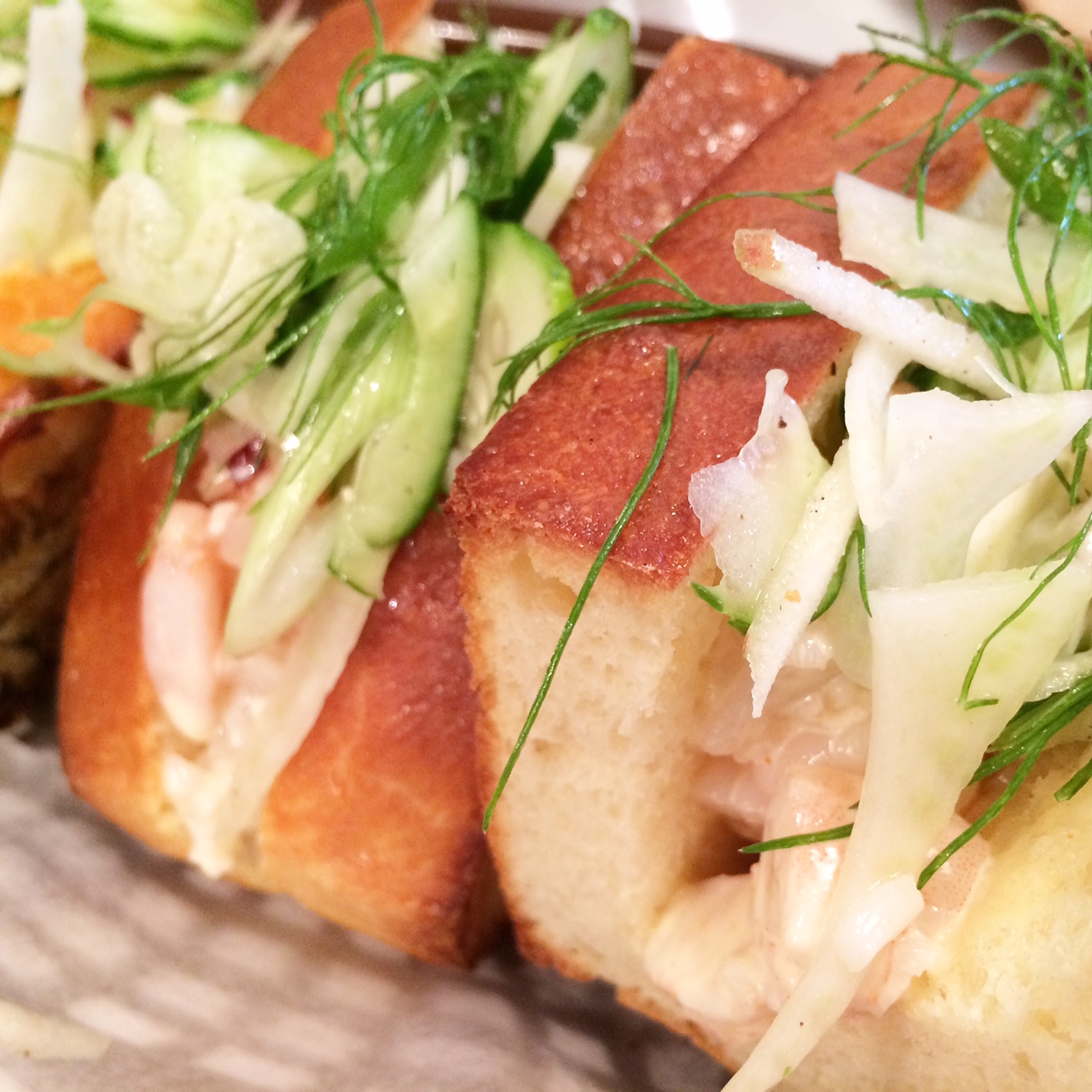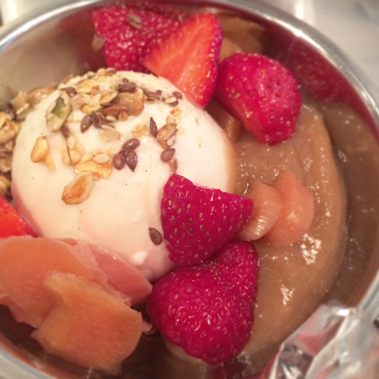 Mes coups de coeur vont à la guédille aux crevette pour la fraîcheur de mélange d’ingrédients des crevettes, fenouil et pomme, mais avec le côté consistant du pain de lait ET le yogourt glacé qui était servi avec rhubarbe, fraises (du Québec en saison!) et mueslis.