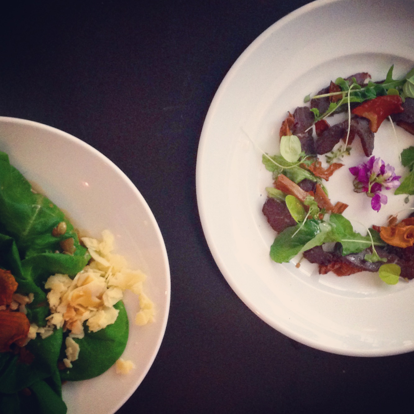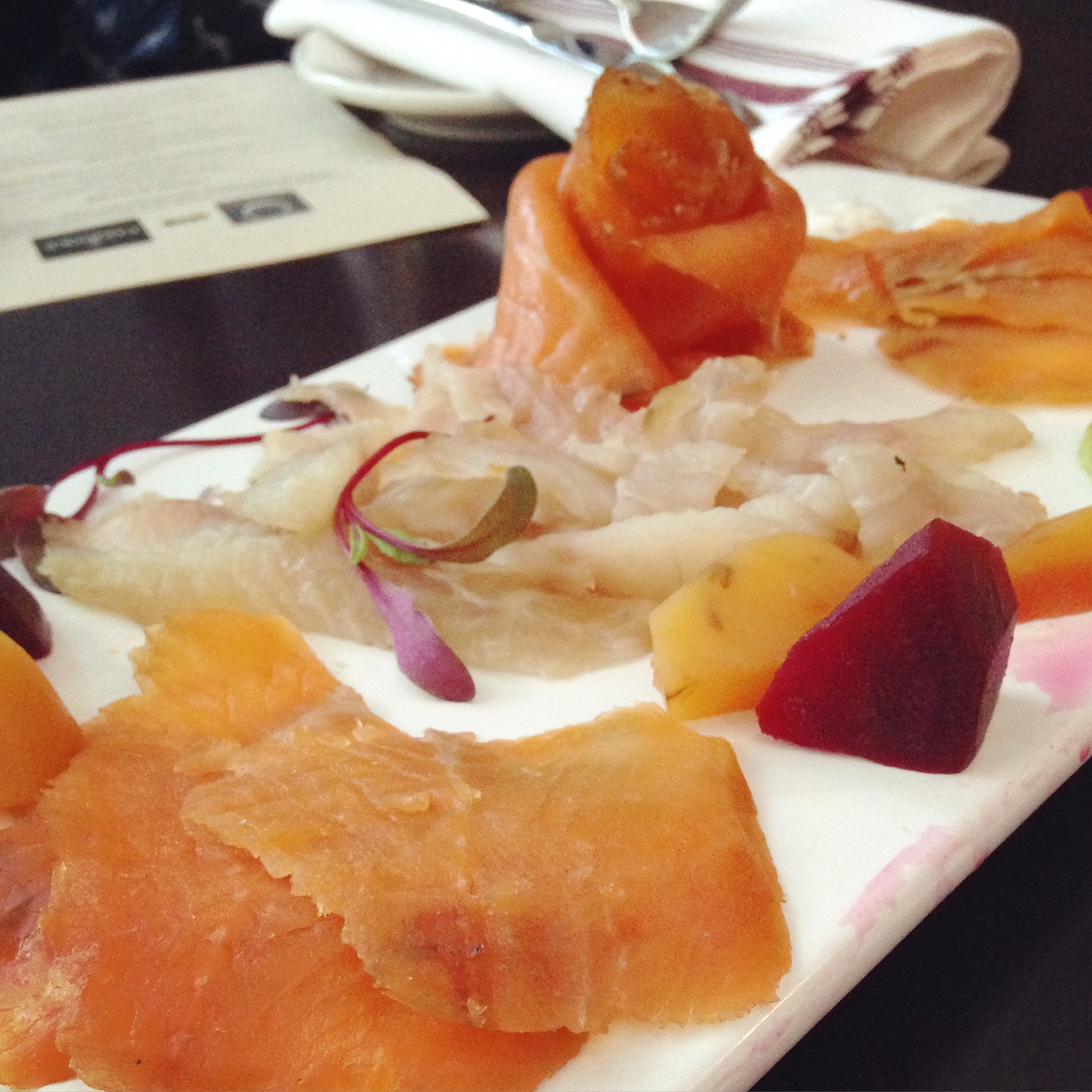 Invitée pour un lunch de chantier, casque de construction fourni (lol), j’ai pu goûter au nouveau menu. Pendant que les travaux suivaient leur cours, moi je me délectais! Ce qui est remarquable, c’est que les plats offerts sont constitués de produits du Québec à 95% et plus! Sans blague, presque TOUS les ingrédients proviennent des régions du Québec comprises entre le long du fleuve St-Laurent et la forêt mixte Laurentienne (d’où le nom Bistro Laurentien!) Ça m’a vraiment impressionnée! Les 5% restants (produits non québécois) sont, entre autre, le sucre, le sel et le cacao. Franchement, quel beau travail de recherche de la part du Chef Jean-Benoit Courcoul! Et pour accompagner ces plats, 25 vins du Québec sont sur la carte, dont plusieurs au verre.