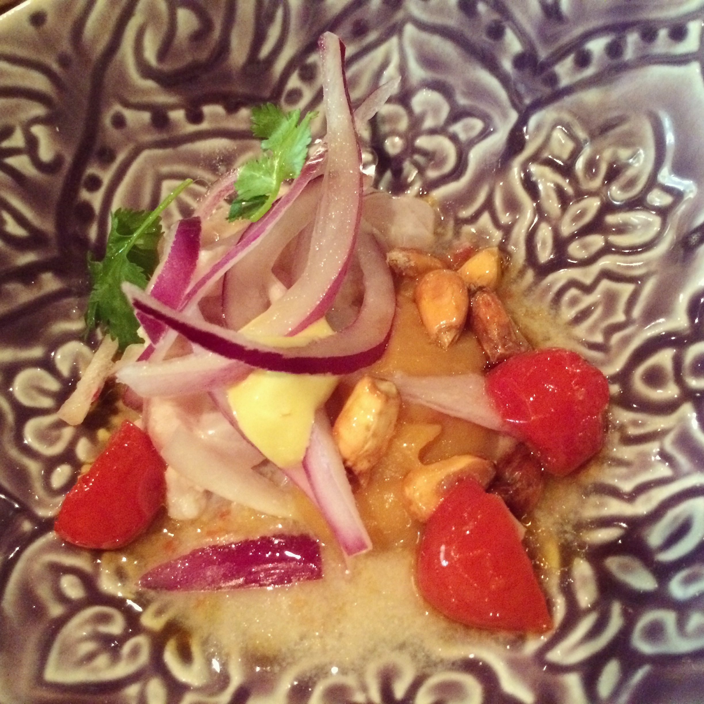 – Ceviche de poisson, jus de lime, oignon, sauce huancaina, piment amarillo