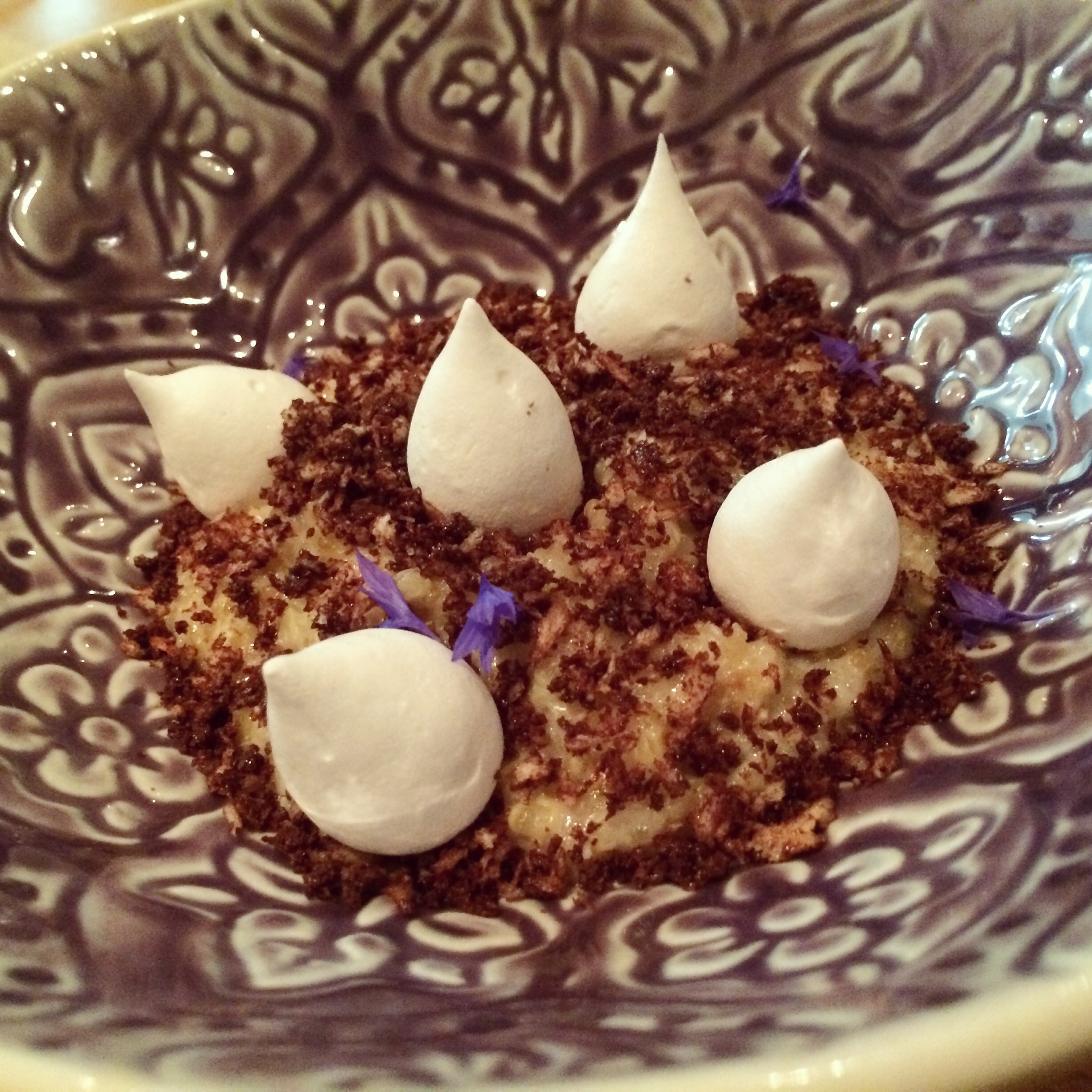 – Pouding au quinoa, ganache au chocolat et noisettes, textures de quinoa, crème au lait de noix de coco