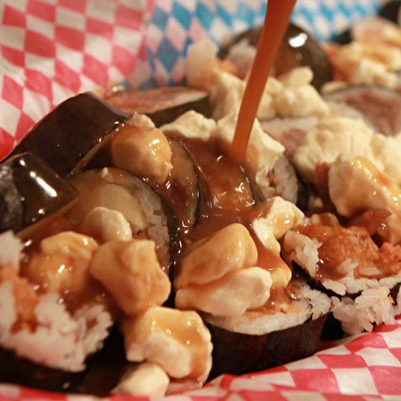 Mes nouvelles créations: Pizza Sushi foie gras, kiwi et pacanes à l’érable, général tofu fromage à griller, smoked meat et cornichon frit.