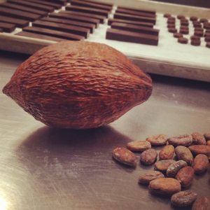 La fabrique, qui n’est pas ouverte au public, comporte plusieurs pièces destinées aux différentes étapes de production et chacune est tempérée selon le besoin. Après avoir fait le tour de celles-ci, notre hôte a eu la gentillesse de nous partager sa vision de son métier. C’est avec beaucoup de passion qu’il nous a fait découvrir les bases de la production, qu’il nous a parlé du côté équitable de son produit et qu’il nous a fait goûter à différents chocolats. Tout comme pour celui des vins, le goût du chocolat diffère selon la provenance des cabosses (fruits du cacaoyer). L’année de récolte est aussi un facteur qui influence la qualité de production. Bref, on peut parler de grands crus tant pour le chocolat que pour le vin!