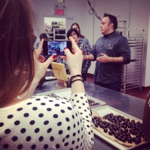 Saviez-vous que selon plusieurs études le chocolat serait bon pour le moral? Pas pour rien que Christophe Morel est si passionné par son métier! Un métier non reconnu au Québec puisque les « hautes études » pour devenir chocolatier se donne en France en Belgique et en Suisse. J’ai cependant été étonnée d’apprendre que la 2e plus grosse usine de chocolat se situe à Sainte-Hyacinthe! Christophe Morel avait beaucoup d’informations intéressantes à nous communiquer… De l’explication des arbres qui produisent la cacao, aux étapes de production du précieux dessert en passant par l’historique de celui-ci. À retenir: le % de cacao d’un chocolat n’indique pas la qualité de celui-ci: plusieurs autres facteurs entre en ligne de compte tel que la part de liqueur de beurre et de poudre de cacao et le nombre d’heures de conchage (étape qui permet de parfaire l’homogénéisation de la pâte de chocolat, tout en améliorant sa finesse. Cette étape permet aussi à l’amertume et à l’acidité de de disparaître progressivement et à développer les arômes initiés lors de la torréfaction.)