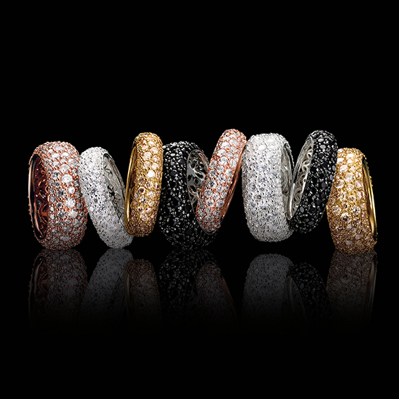 Une bague toute en brillance et en texture. Parfait pour celles qui aiment moins les grosses pierres, mais qui veulent tout de même briller! La structure travaillée dans les règles de l‘art du pavé de zircons blancs, noirs ou champagne irrégulièrement sertis, confère une brillance particulière combinée avec l‘argent sterling 925 ou les dorures en or rose ou jaune (18 k).