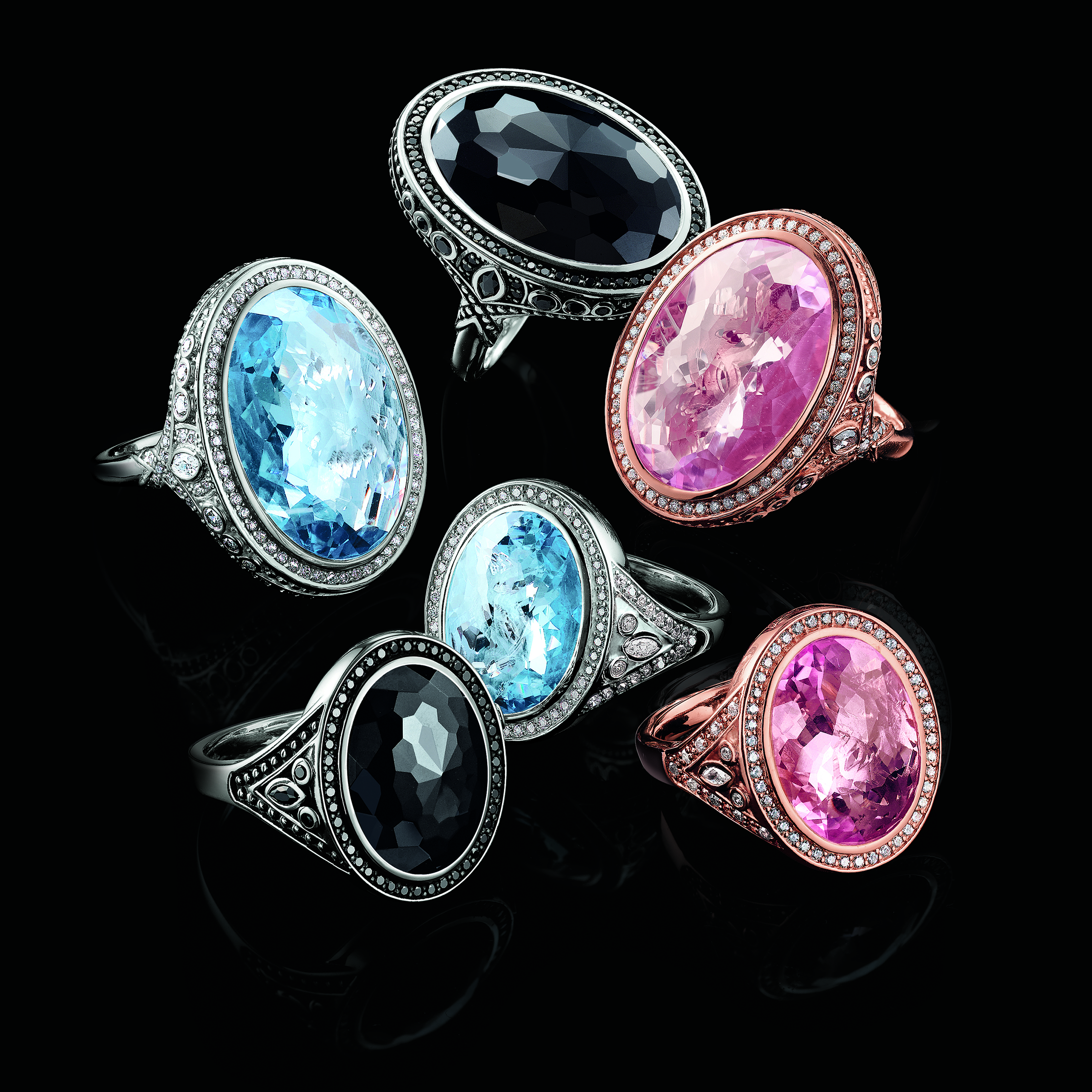 Cette bague a du cran. Les pierres affichent des couleurs éclatantes qui rayonnent grâce à la taille Signature Cuts. Regardez à travers cette pierre et vous y découvrerez peut-être le secret du cosmos! Une bague simple, mais élégante; féminine, mais puissante. Ce modèle est offert en bleu saphir, en rose tendre ou encore le vert émeraude. Elles peuvent être combinées aux boucles d‘oreille et aux pendentifs de la série afin de compléter le look!