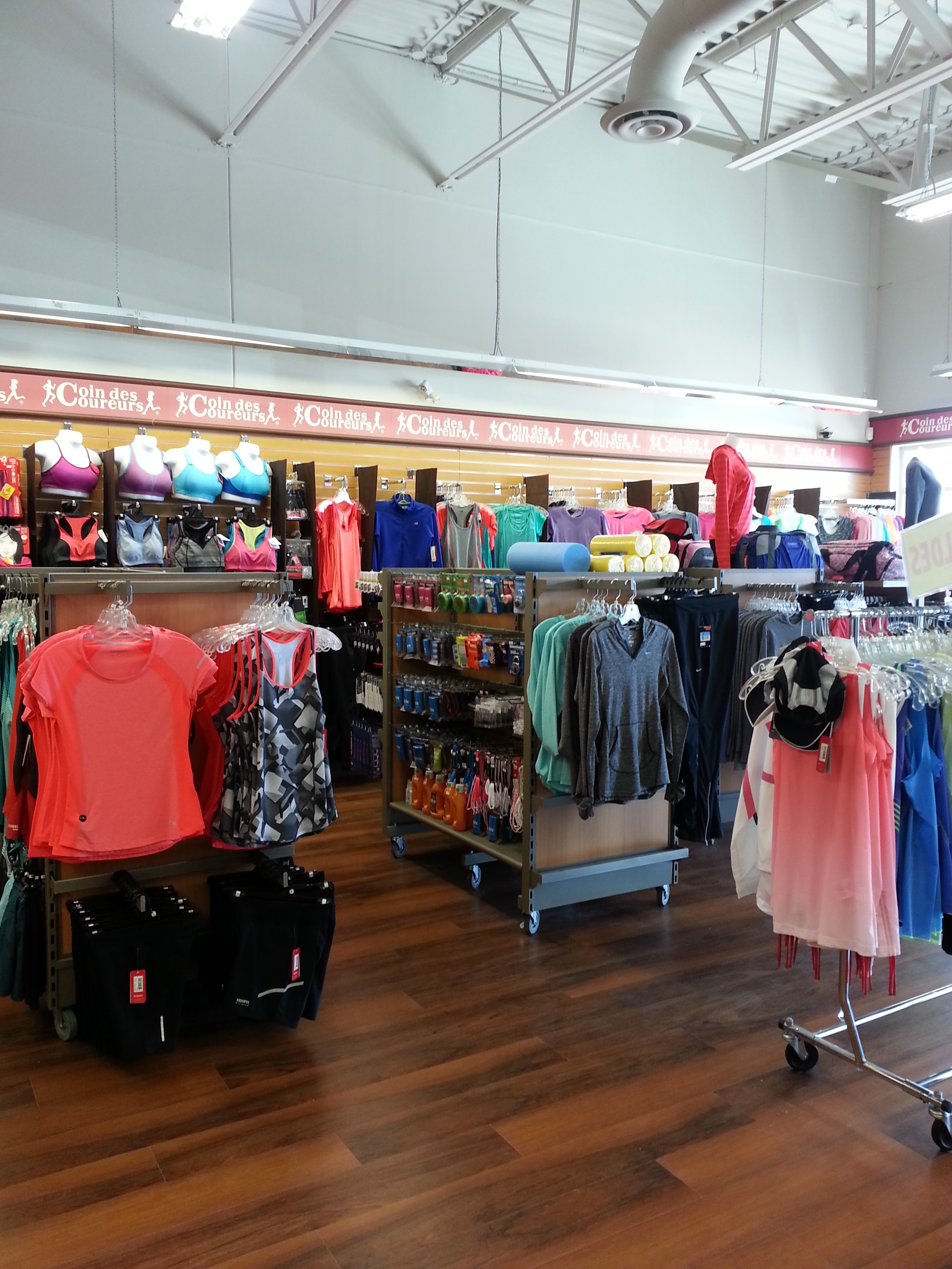 Le Coin des Coureurs étant la boutique la plus près de chez moi, je décide donc de faire mon premier arrêt à cet endroit. Bien qu’au premier coup d’œil la boutique n’ait rien d’exceptionnelle (l’endroit est assez petit, rien de design) il faut savoir que le Coin des Coureurs, aussi connu sous le nom de Running Room, possède sa propre ligne de vêtements maison de même que des boutiques à travers l’ensemble du Canada ainsi qu’aux États-Unis. Au rayon des vêtements et des chaussures, on y retrouve les marques habituelles telles qu’Adidas, Brooks, Asics, North Face, New Balance, Nike, Saucony et Mizuno. De plus, le Coin des Coureurs étant partenaire de la course à la vie CIBC de la Fondation canadienne du cancer du sein, on y retrouve la collection de vêtements Ruban Rose dont une partie des profits est versée à l’organisme afin de supporter leur vision d’un avenir sans cancer du sein. Vous pourrez également retrouver en boutique un bon choix d’accessoires et vous inscrire à des séances de course en groupe en vue de vous aider à atteindre vos objectifs.