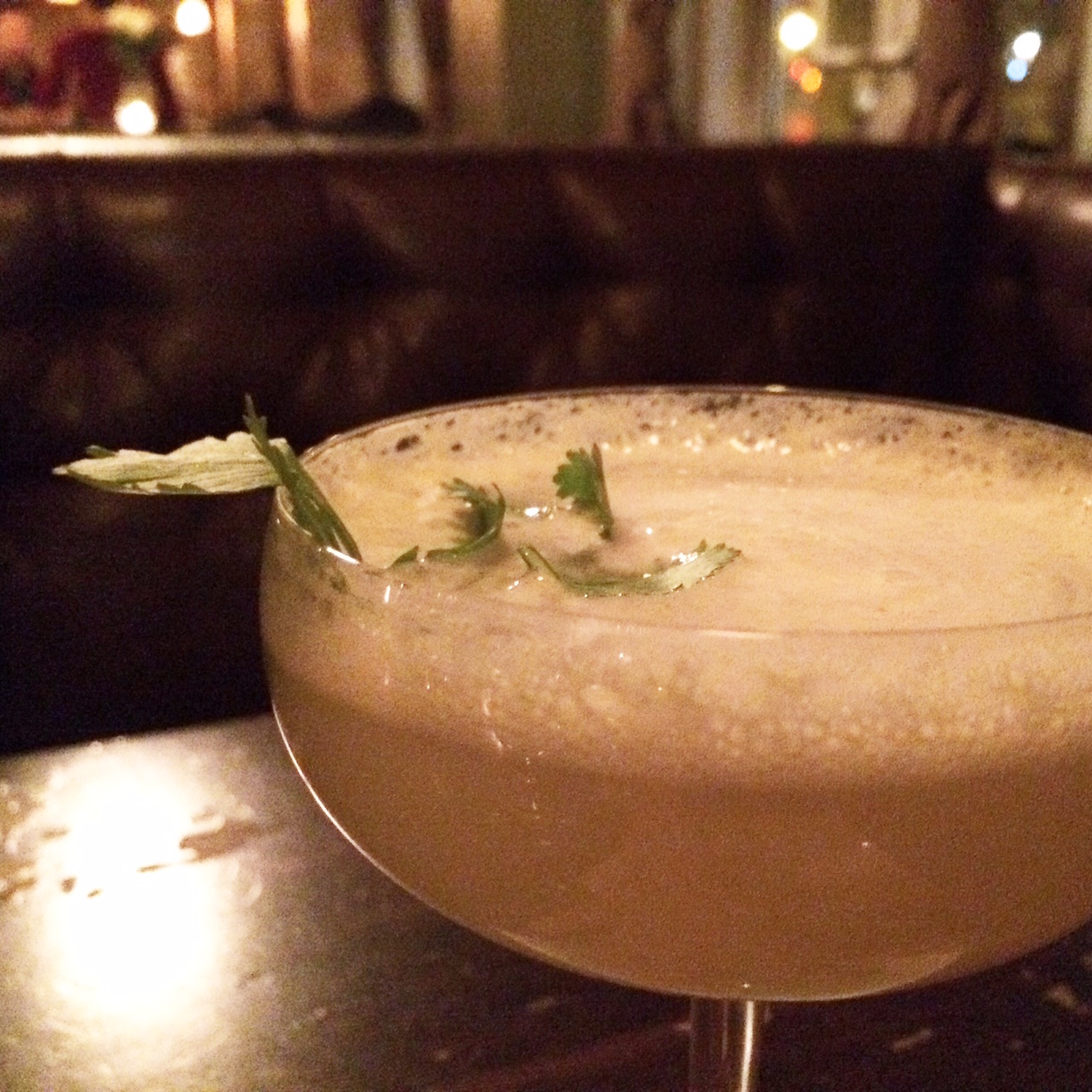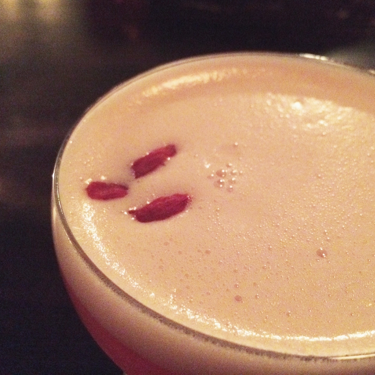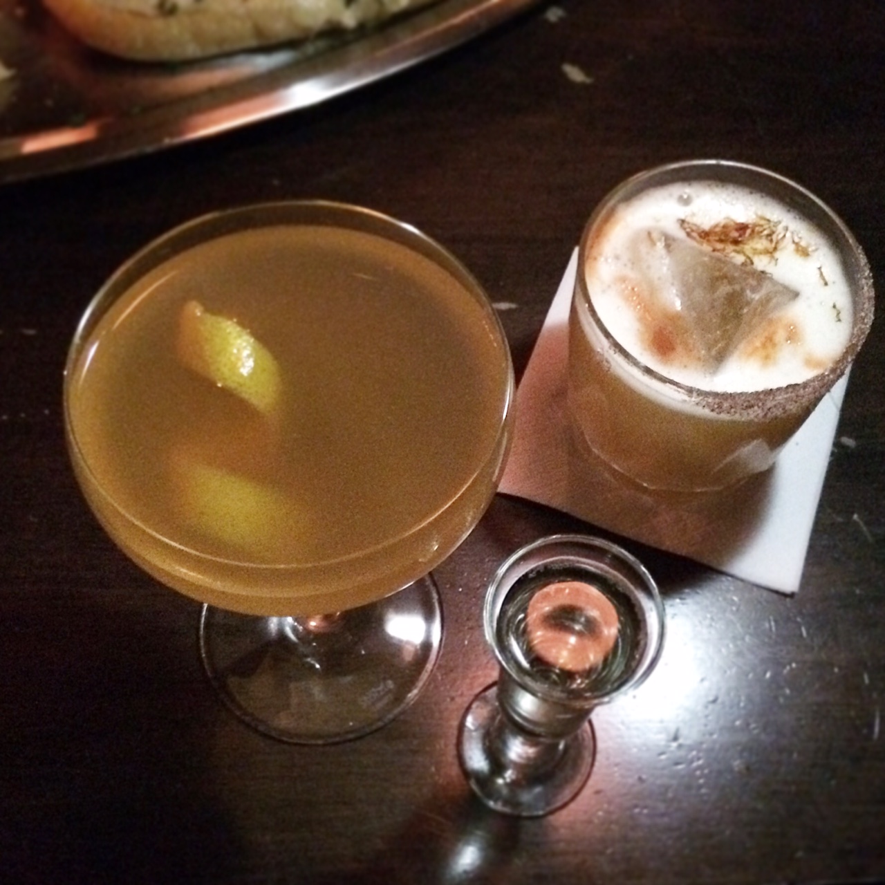Le Goji Kiss (gin, liqueur de sureau, jus de goji, thé Kusmi chai, citron frais, jus de canneberge, blanc d’oeuf) se boit littéralement comme du petit jus; un petit goût acidulé et pas trop sucré! Le green velvet (gin, absinthe, thé Kusmi gyuokuro, concombre, lime frais et mousse de céleri et coriandre) est frais en bouche et végétal, parfait pour ceux qui aiment l’amertume d’un gin-tonic-concombre. Le teatime (Cachaça Leblond, sirop de framboise, thé Kusmi indien Assam et amer à la rhubarbe); girly à souhait, servit dans une belle petite tasse vintage et accompagné de biscuits est un cocktail très doux à son image. Le Daisy Twist (rhum, porto, drysack, citron frais, sirop Traktir, gelée de porto et thé), servit avec une petite cuillère de gelée de porto à mélangé au drink avant de consommer est super in-thé-ressant aussi ;) Le regent punch (cognac, rhum, absinthe, sirop d’ananas, citron frais et prosecco), un mélange un peu plus corsé avec une touche acide est servit avec un shooter de prosecco à verser doucement pour le plaisir de quelques bulles. Finalement, le Safran Sour (bourbon, purée de fruit de la passion, sirop de safran, thé à la camomille, blanc d’oeuf) offre une finale amère et le goût du safran, très original pour un cocktail!