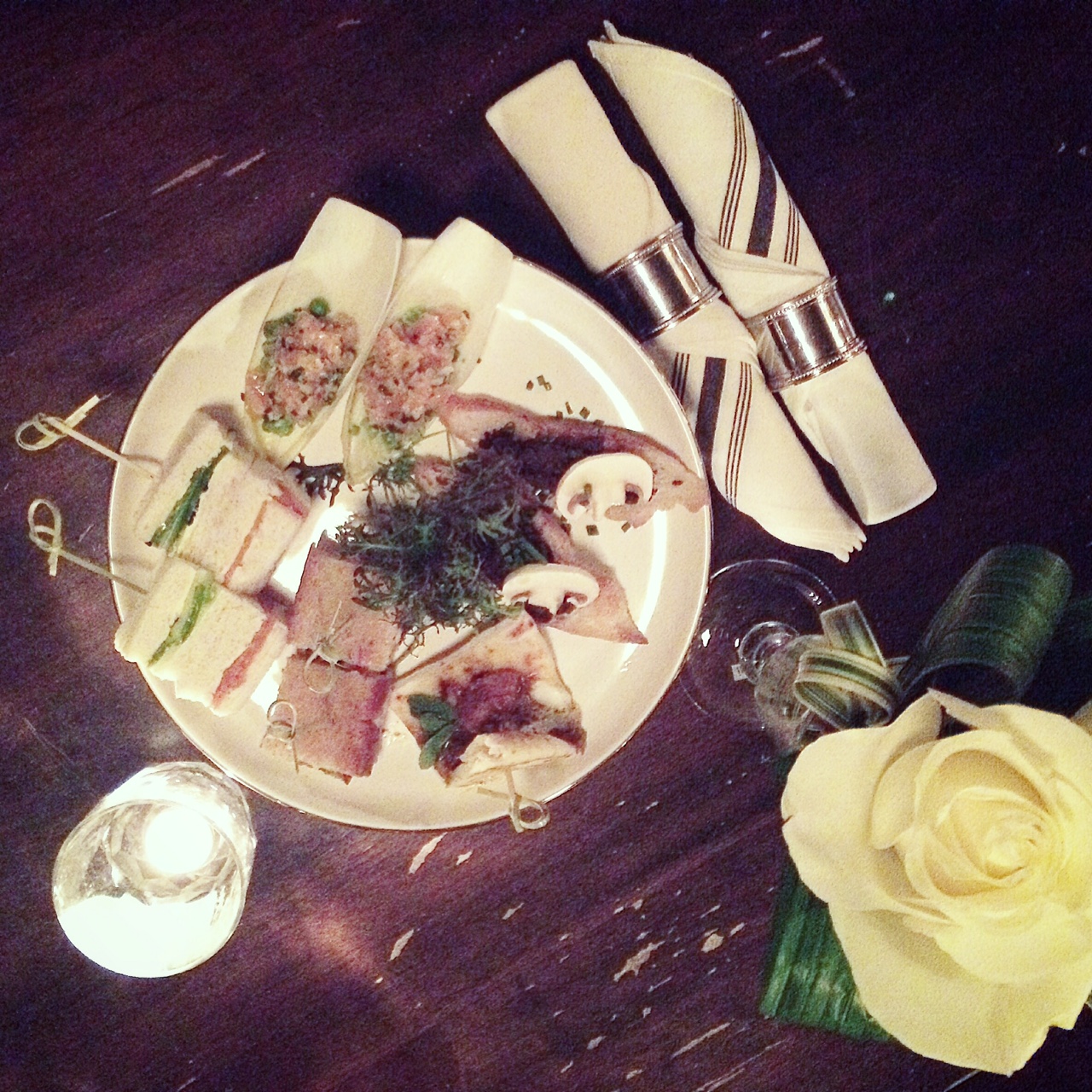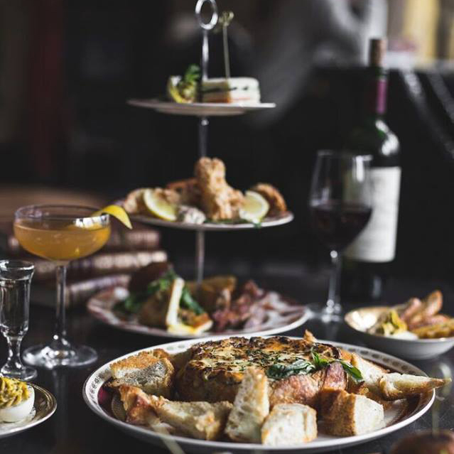 Un petit creux? Pas de problème! On continue avec notre thématique londonienne… Pour le 5 à 7, le Mayfair propose différentes petites bouchées servies dans assiettes vintage à dorures et montées en étage: mini-sandwich caviar/concombre ou saumon fumé à l’aneth, morue panée, tartare, grilled cheese, etc. Vraiment trop class!