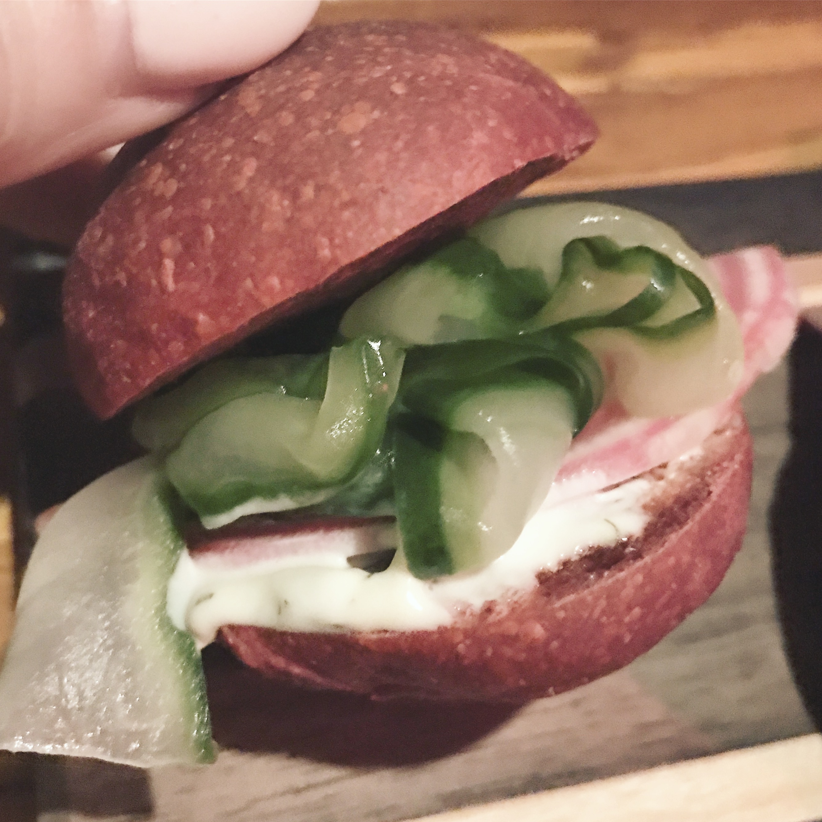 Il y a des options santé telles que des salades très rafraîchissantes (celle au fenouil et pamplemousse, ainsi que celle au melon d’eau et mousse de feta étaient délicieuses!), des options végé comme les mini-burgers de betteraves et concombres, et d’autres options un peu plus gourmandes comme les mini-burgers au bacon doublement fumé ou les guedilles aux crevettes, mayo épicée. Une offre diversifiée qui pourra plaire aux goûts de tout le monde. En plus, la présentation des plats est super!
