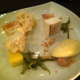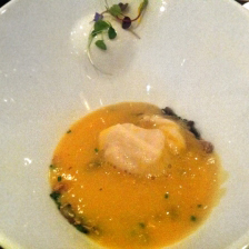 Par une soirée de février froide que je me suis rendue chez Apollo avec mon copain pour célébrer un événement spécial. J’étais déjà allée au bistro Apollo et je m’attendais à y retrouver le même concept; un aliment apprêté de 3 manières différentes grâce à la cuisine moléculaire, surtout que c’est toujours la promesse qu’on nous fait sur le site internet. Or ce concept n’est disponible qu’au bistro, donc légère déception à mon arrivée. Cependant, on a vite fait de me prendre en main en m’expliquant la complexité des différentes étapes de cuisson des plats… En fin de soirée, j’ai été tout de même étonnée de rencontrer chef Apollo en personne. J’ai été pas mal impressionnée par le fait qu’il prenait le temps d’aller discuter avec chacune des tables de son restaurant; comme quoi le succès et la popularité ne l’empêche pas d’être prêt des gens et de s’intéresser à ses clients.