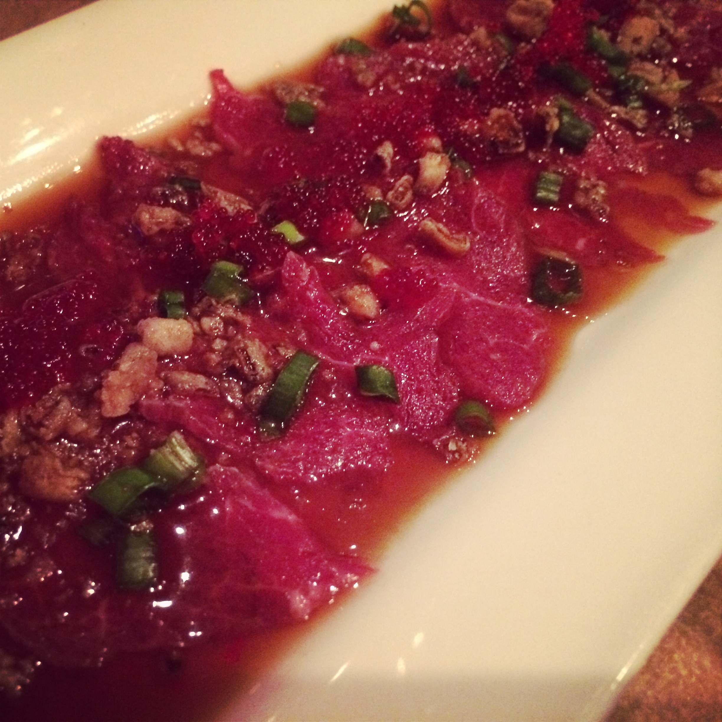 – Tataki de boeuf filet mignon servi avec une sauce ponzu épicée