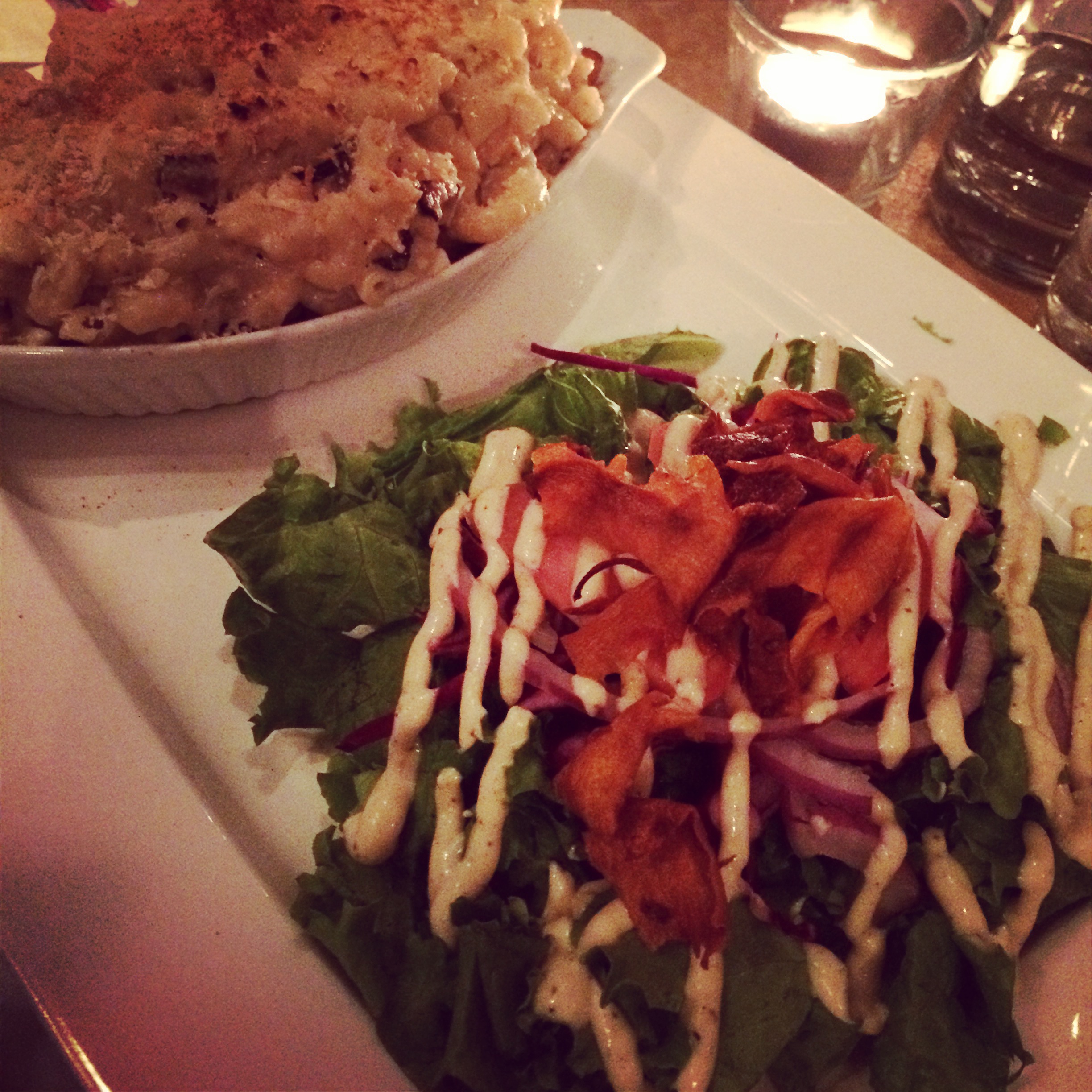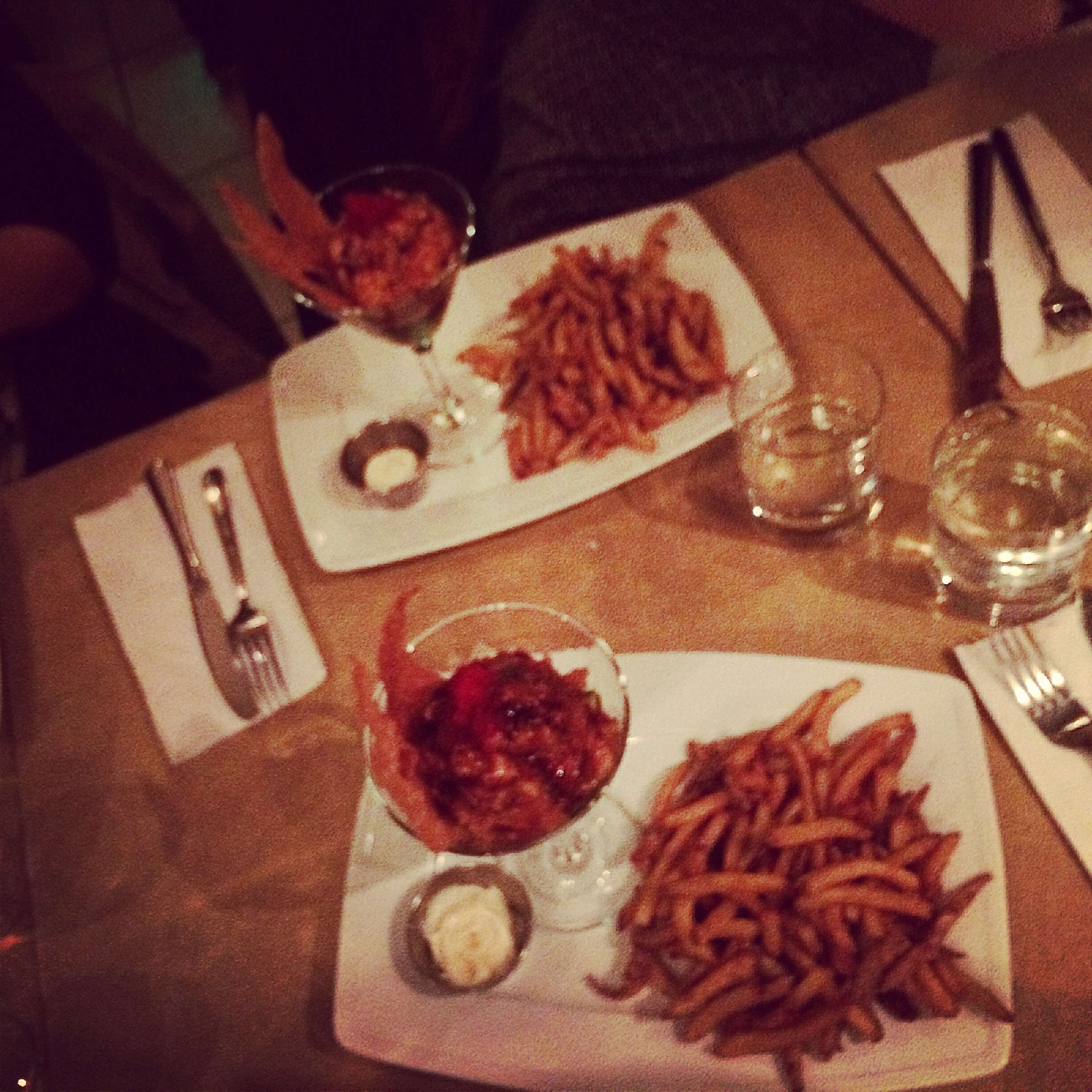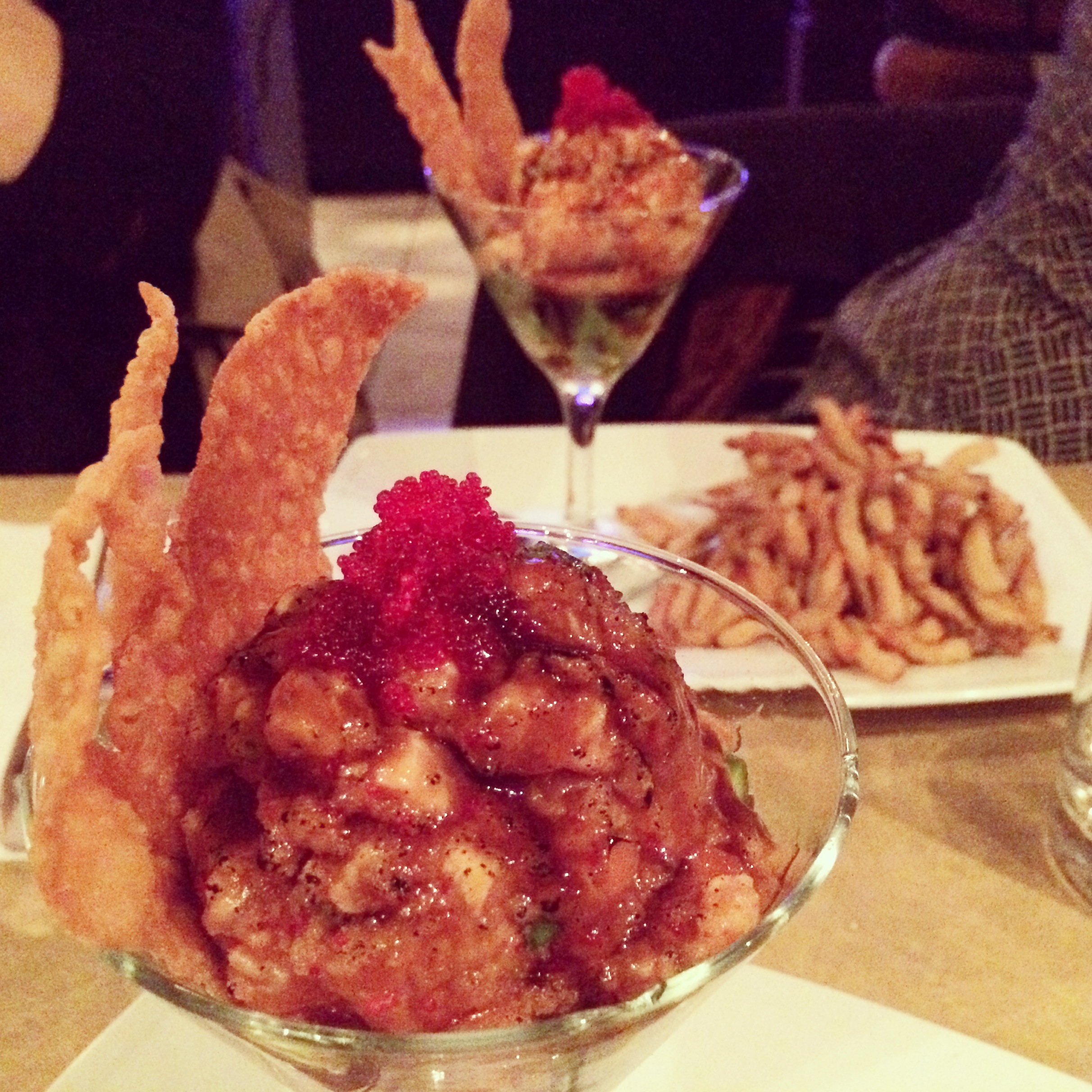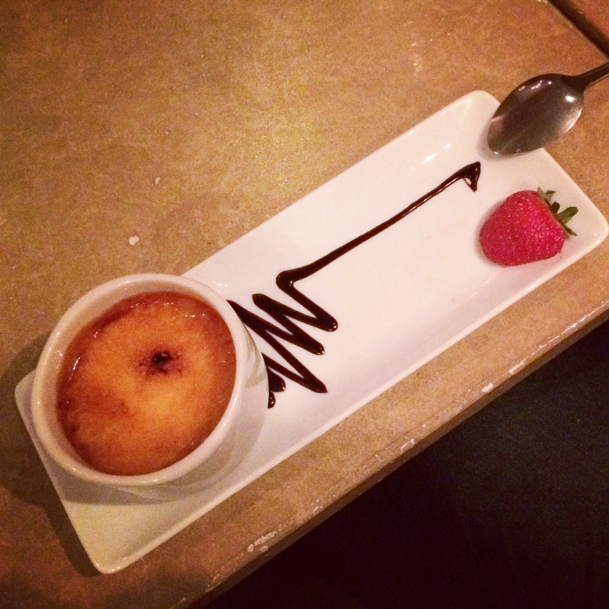 L’entrée d’algues et de pieuvre était très fraîche, goûteuse et parfait pour mettre en appétit (à condition d’aimer le goût prononcé de l’algue wakame évidemment). Mais parlons d’appétit, le mien a presque été coupé quand j’ai vu l’entrée de me voisine: une marre de sang dans une assiette plate… je veux dire le tataki de boeuf filet mignon. J’ai tout de même tenté ma chance en y goûtant une bouchée et je dois avouer que c’était succulent: tendre à souhait et parfaitement assaisonné. Belle présentation pour le tartare de saumon servi dans un grand verre à martini. Le tartare reposait sur une base d’avocat bien mûr et frais et garni de « faux caviar » et d’une sauce sucré style teriyaki. Le tout aurait très bien pu frôler une note parfaite si ce n’était de la texture pâteuse et du manque de fraîcheur. Dommage. Pour ce qui est du Mac & cheese poutine avec homard et bacon, la proposition semblait surprenante, voire même indécente, mais au final beaucoup plus fade que ce qu’on aurait pu pensé: homard presque inexistant, manque de saveur et un peu trop sec, selon mon appréciation. Pour finir, la crème brûlé était toute simple, sans extravagance, mais parfaitement réalisée, donc aucune déception possible pour une fan de ce dessert.